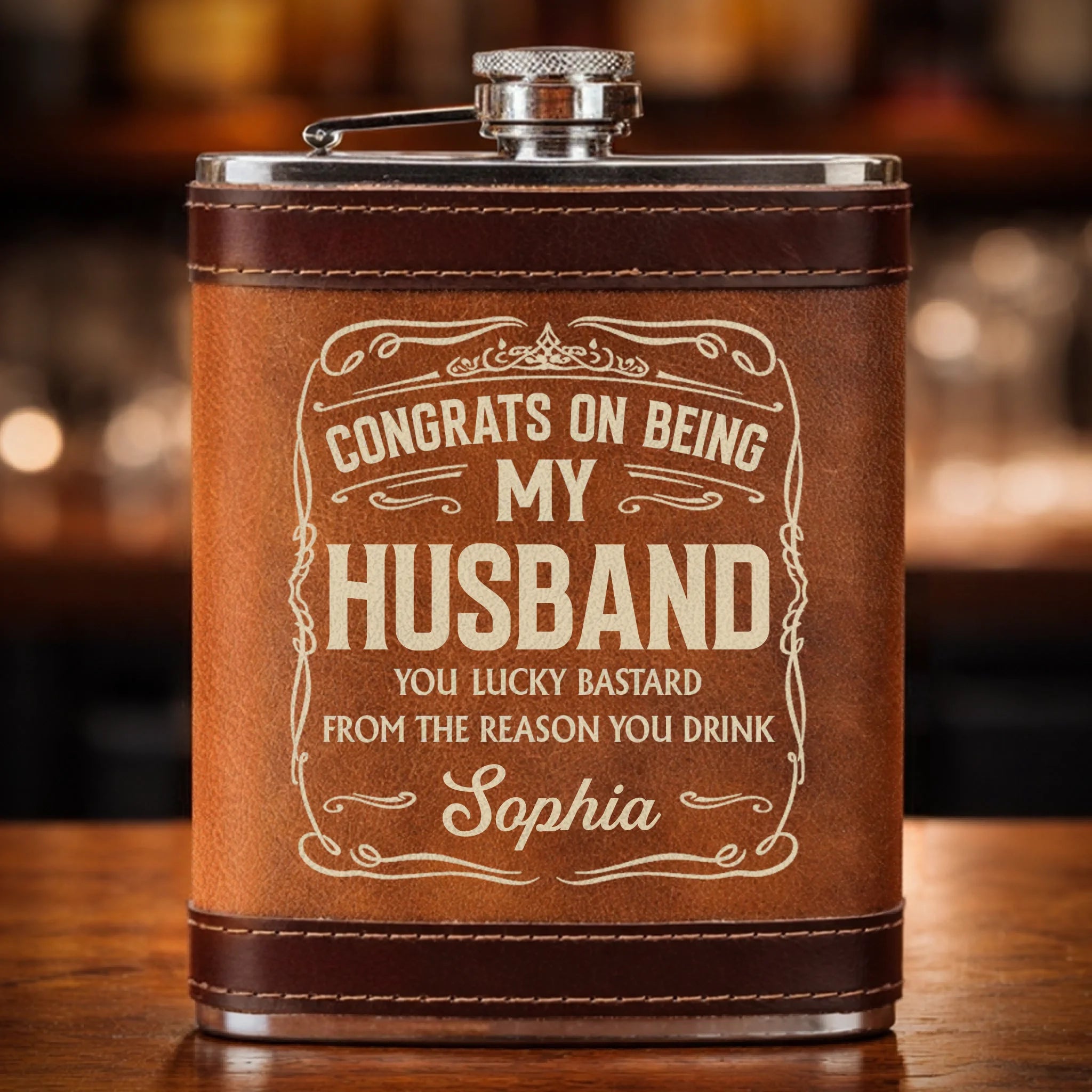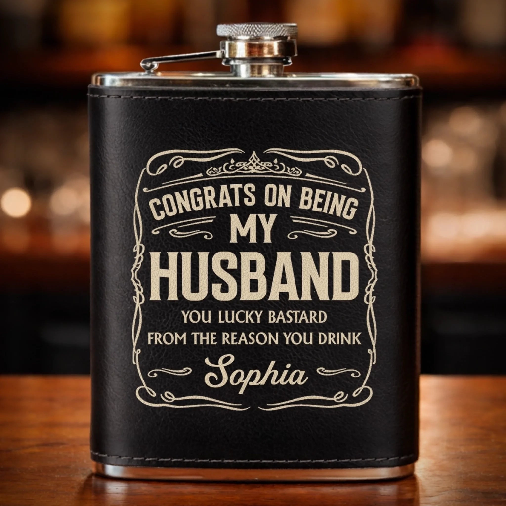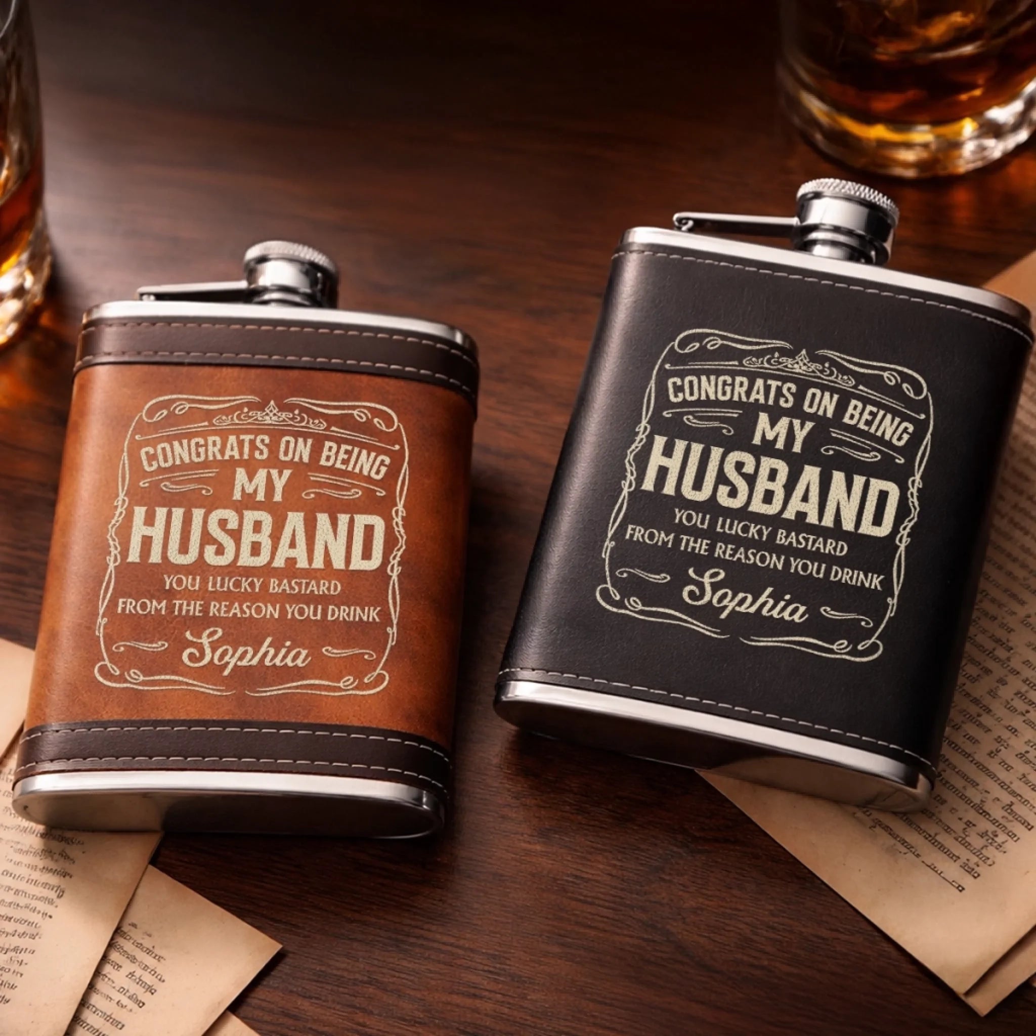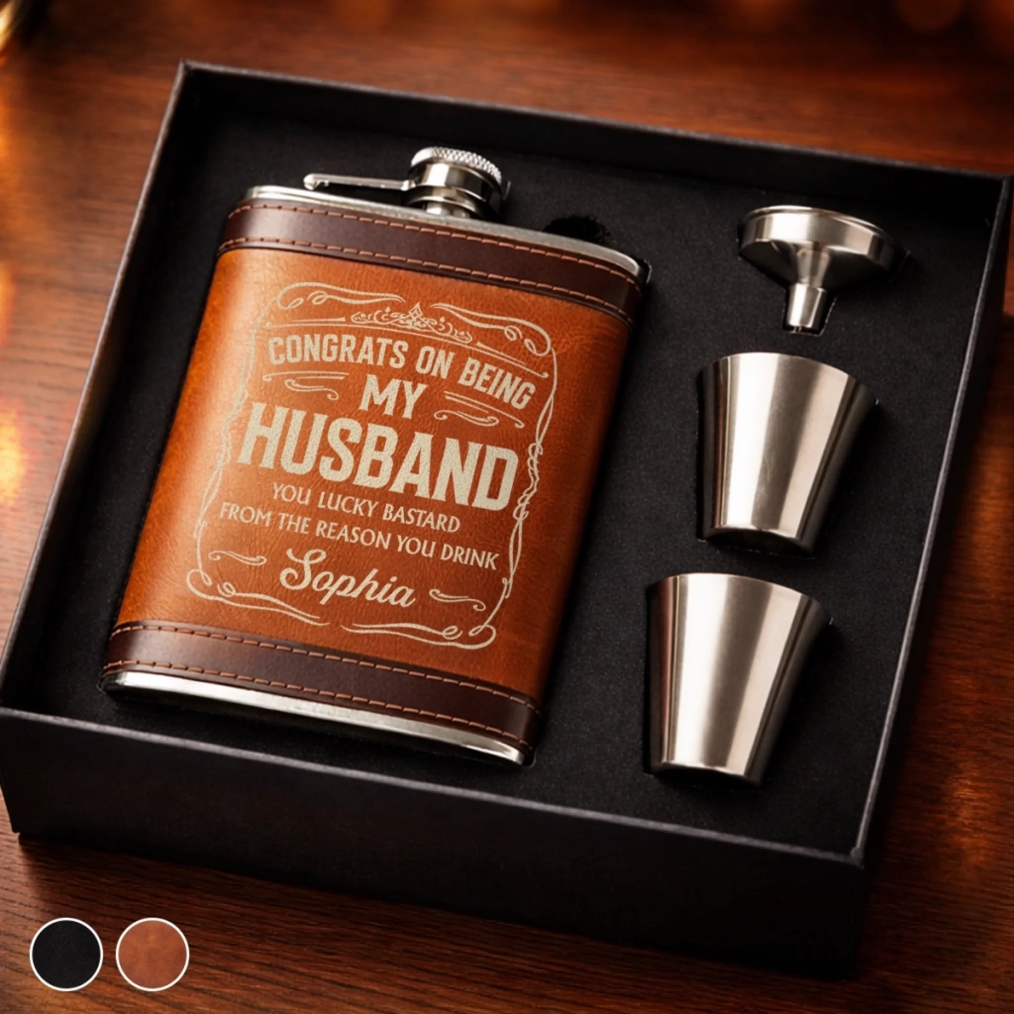 Custom Hip Flask Set - Personalized Anniversary Wedding Gifts For Husband And Wife, Him And Her - Built On Care And Time