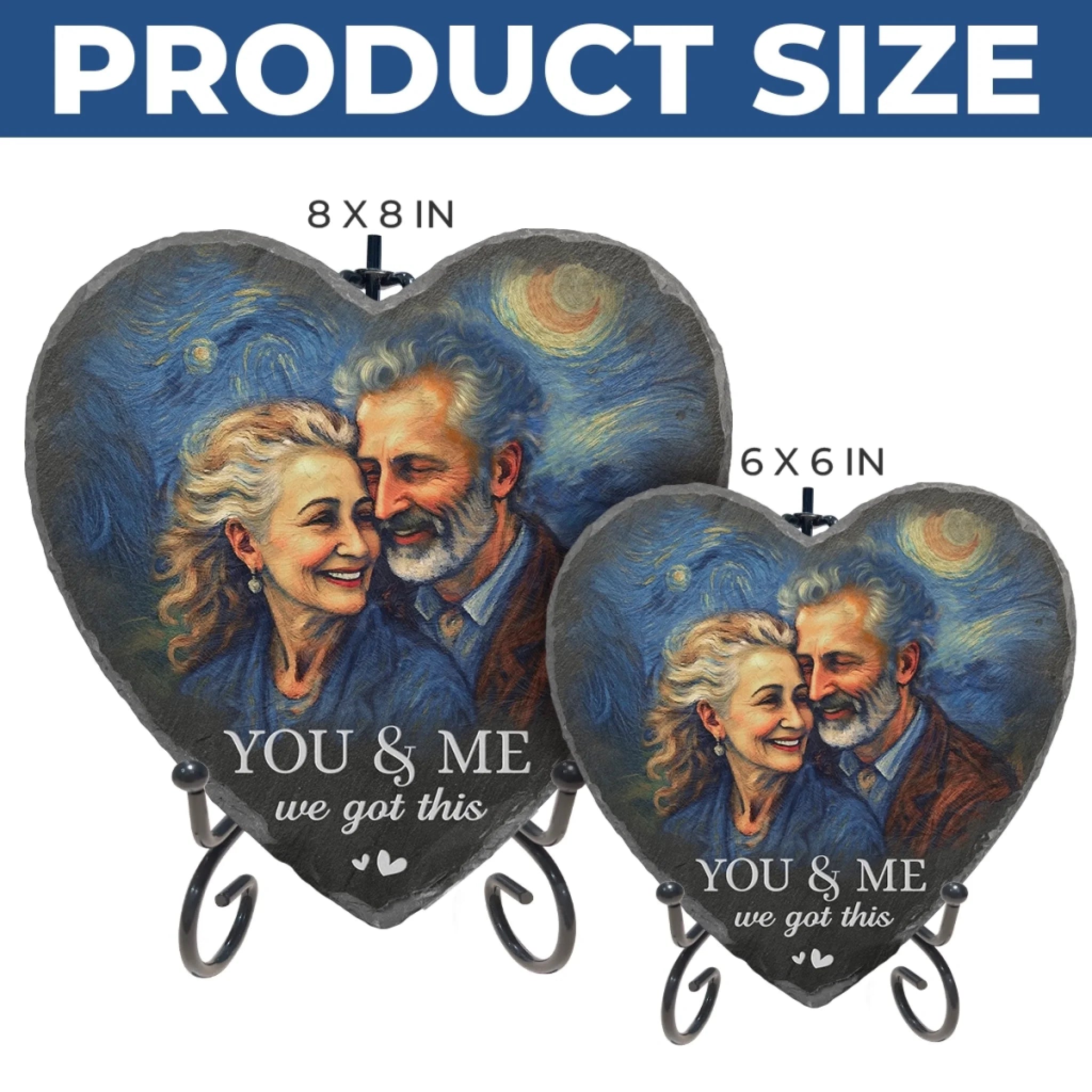 Célébrez un amour durable avec notre pierre en forme de cœur personnalisée façon Van Gogh – You And Me, We Got This – une façon touchante de transformer votre plus beau souvenir en un souvenir précieux. Idéal pour les couples de longue date, les couples qui célèbrent des moments importants ou toute personne célébrant des années d'amour. Que ce soit pour un mariage, un anniversaire – du cuir et de l'argent aux perles et à l'or – ou pour des occasions spéciales comme la Saint-Valentin, un anniversaire, Noël, la fête des Pères, la fête des Mères ou Thanksgiving, ce cadeau photo personnalisé affirme : « Nous avons parcouru un long chemin, et nous sommes toujours ensemble. »